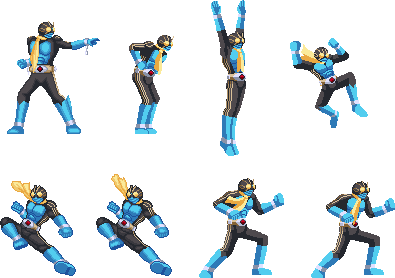 3号素材 改変ライダーキック 2015.03.06 新1号素材改変でライダーキック。 垂直ジャンプからの下降という一番単純なもの。 この技いずれ軽く前方向に飛びながらジャンプ頂点で前転し、キックで下降する技にしたいと考えてます。 その動きのほうがより、ライダーキックらしいので。 今回は時間がないので単純な改変でのみとしておきます。